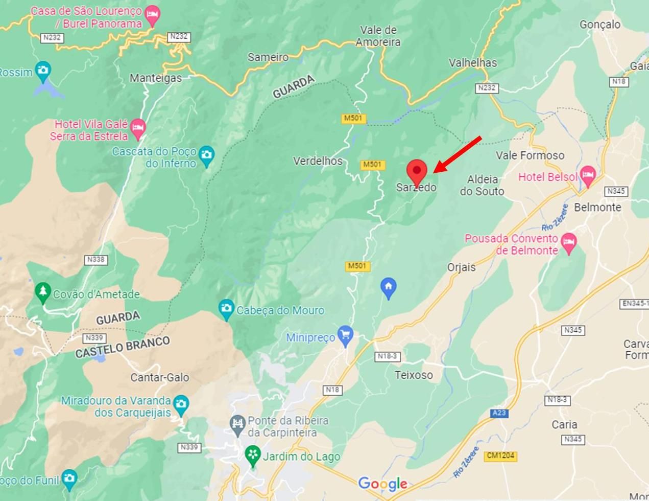 Fica a 11km da vila do Teixoso e a 15 km da cidade da Covilhã.  A bonita praia fluvial de Verdelhos fica a 9 km e a praia fluvial de Valhelhas fica a 18 km.