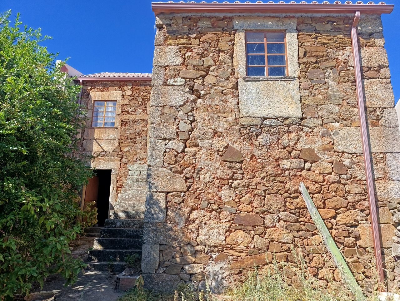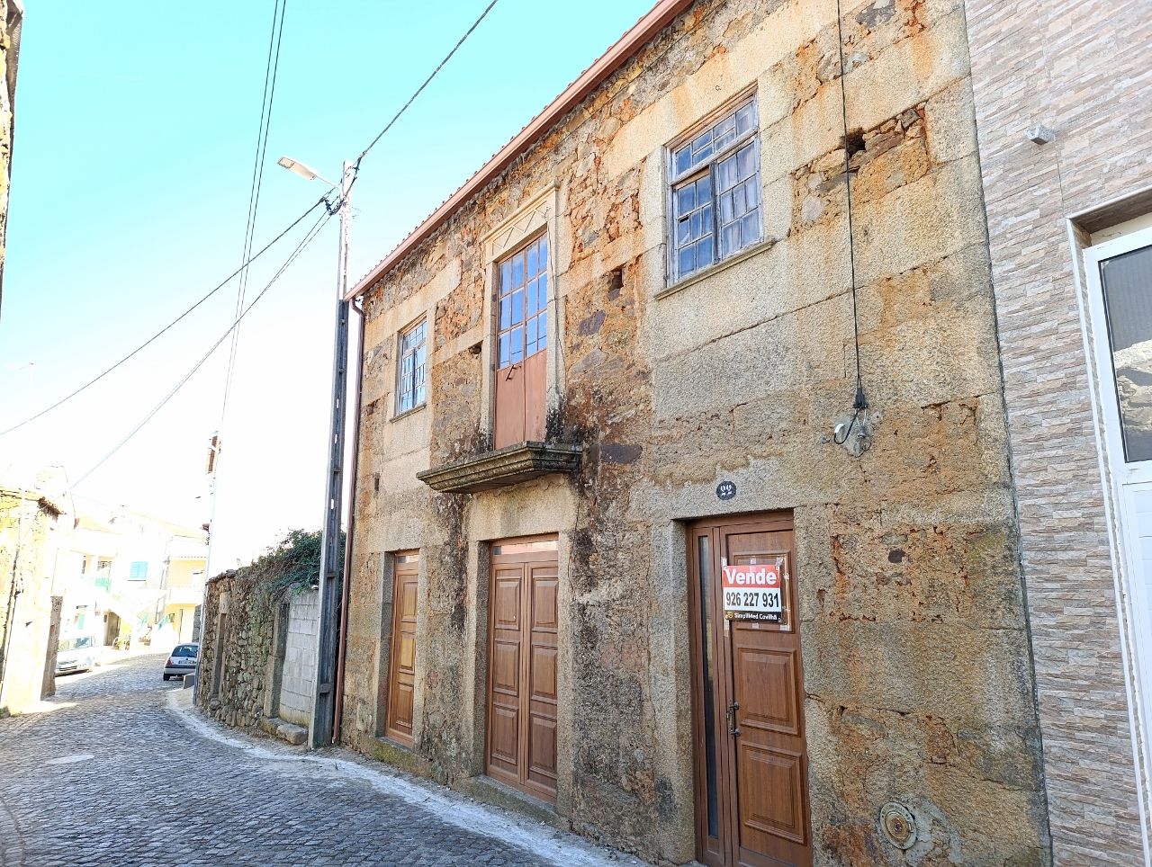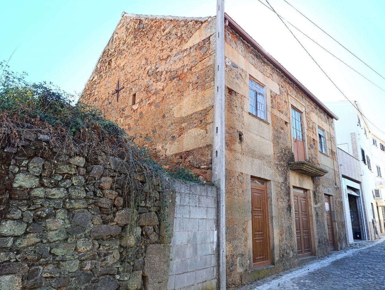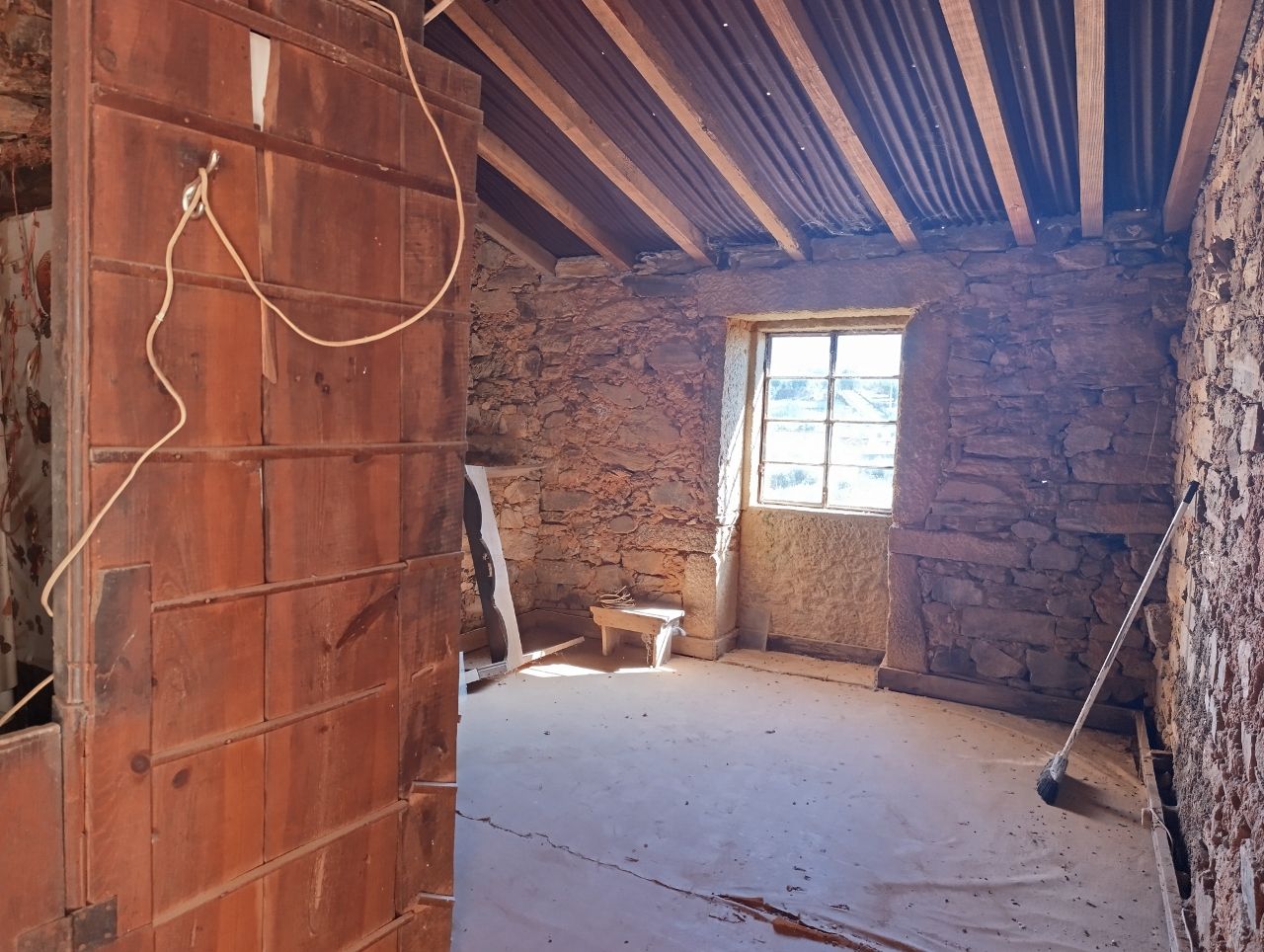 A casa tem a área bruta de 144 m2: no rés do chão tem uma divisão ampla e uma cozinha no quintal. No 1º piso tem 1 cozinha, 1 sala e 4 quartos. No 2º piso tem o sótão amplo. O telhado está bom, foi feito há apenas 5 anos. A estrutura da casa é toda em pedra, o teto de madeira está bom e grande parte do soalho também está bem conservado.