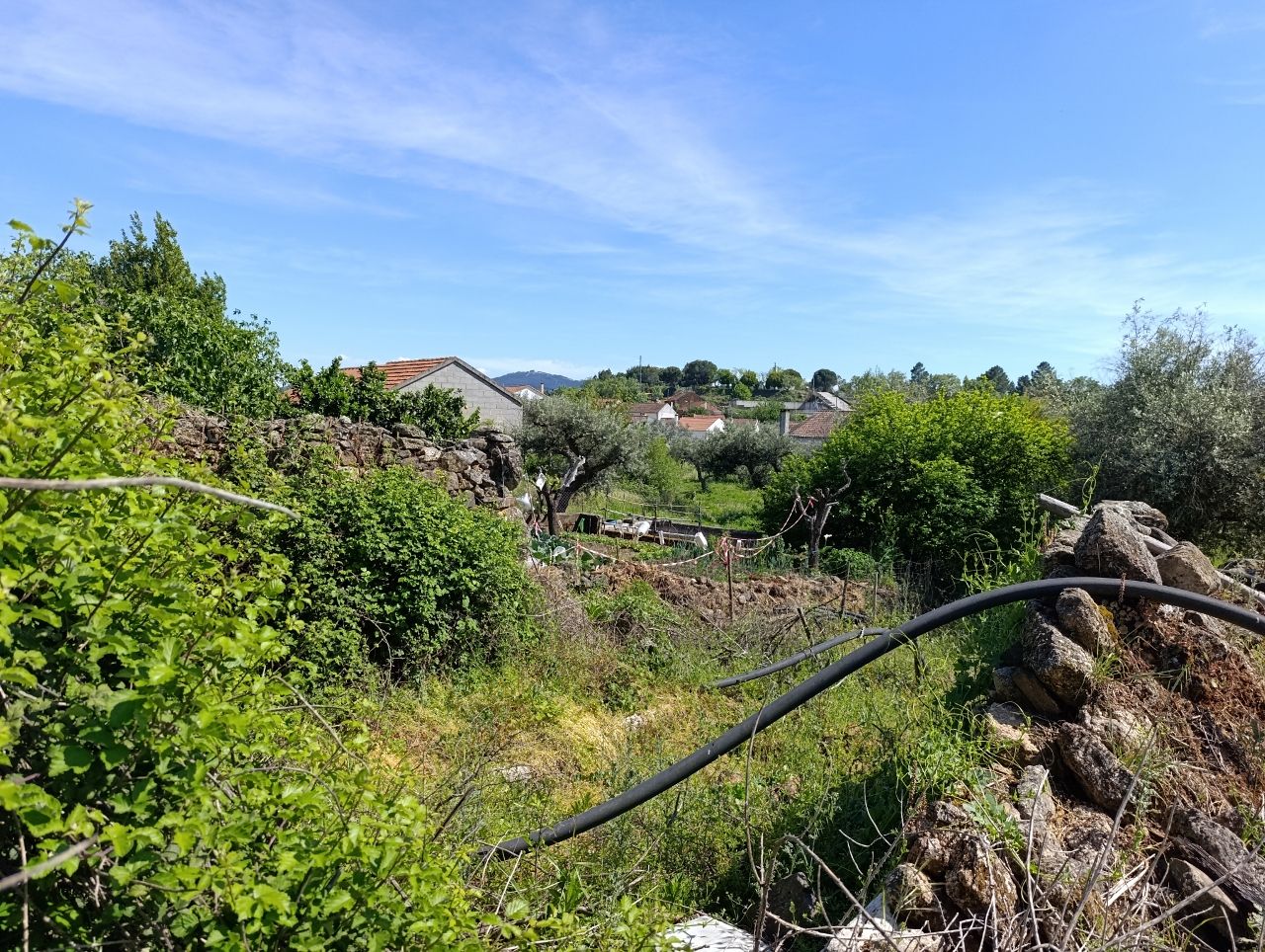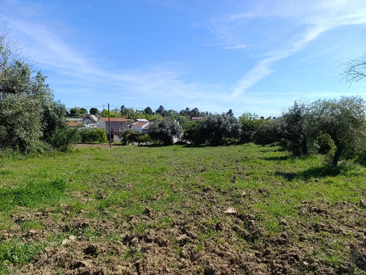 No terreno tem água do regadio, 1 wc, tem oliveiras, figueiras, romãzeira, tangerineira e limoeiro.