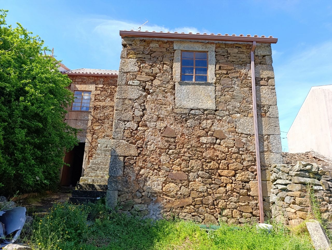 A casa tem a área bruta de 144 m2: no rés do chão tem uma divisão ampla e uma cozinha no quintal. No 1º piso tem 1 cozinha, 1 sala e 4 quartos. No 2º piso tem o sótão amplo. O telhado está bom, foi feito há apenas 5 anos. A estrutura da casa é toda em pedra, o teto de madeira está bom e grande parte do soalho também está bem conservado.